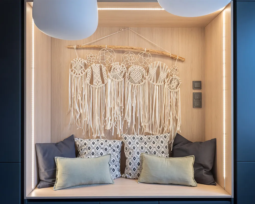 • Светодиодная лента Лента светодиодная 12V 14,4W 60Led 5050 IP20 теплый белый, 5м — незаменимый инструмент для создания графических линий и дополнительной подсветки. Её установили в нише и стеллаже, чтобы подчеркнуть детали интерьера. Высокая плотность светодиодов (60 шт/м) обеспечивает яркий, равномерный и стабильный световой поток .